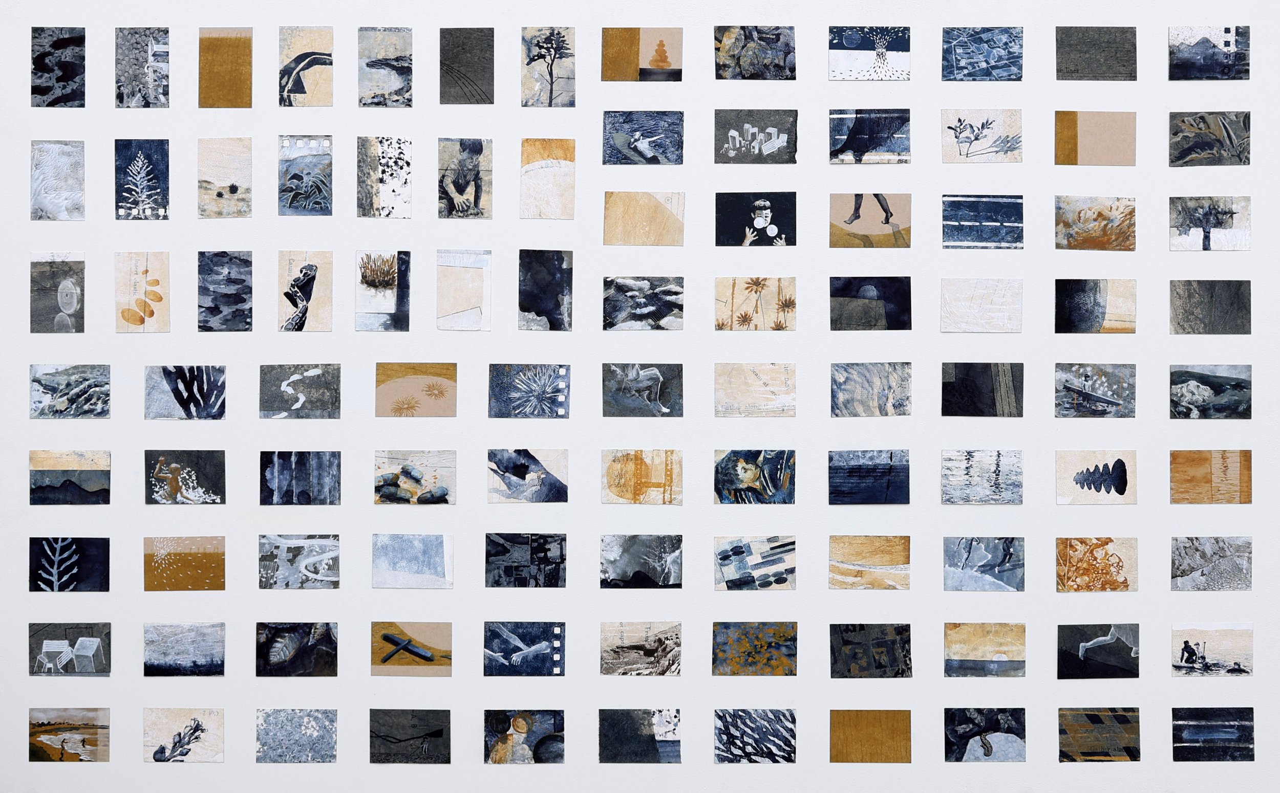 Acrylic, watercolor, indigo dye, pencil, canvas, muslin, and paper on panel